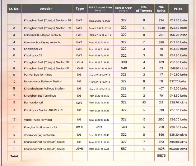 ही घरे City and Industrial Development Corporation of Maharashtra Ltd (सिडको) अंतर्गत विकसित करण्यात आली असून प्रामुख्याने आर्थिक दुर्बल घटक (EWS) आणि अल्प उत्पन्न गट (LIG) यांच्यासाठी उपलब्ध आहेत. केंद्र सरकारच्या Pradhan Mantri Awas Yojana (PMAY) योजनेअंतर्गत पात्र लाभार्थ्यांना अनुदानाचाही लाभ मिळू शकतो.