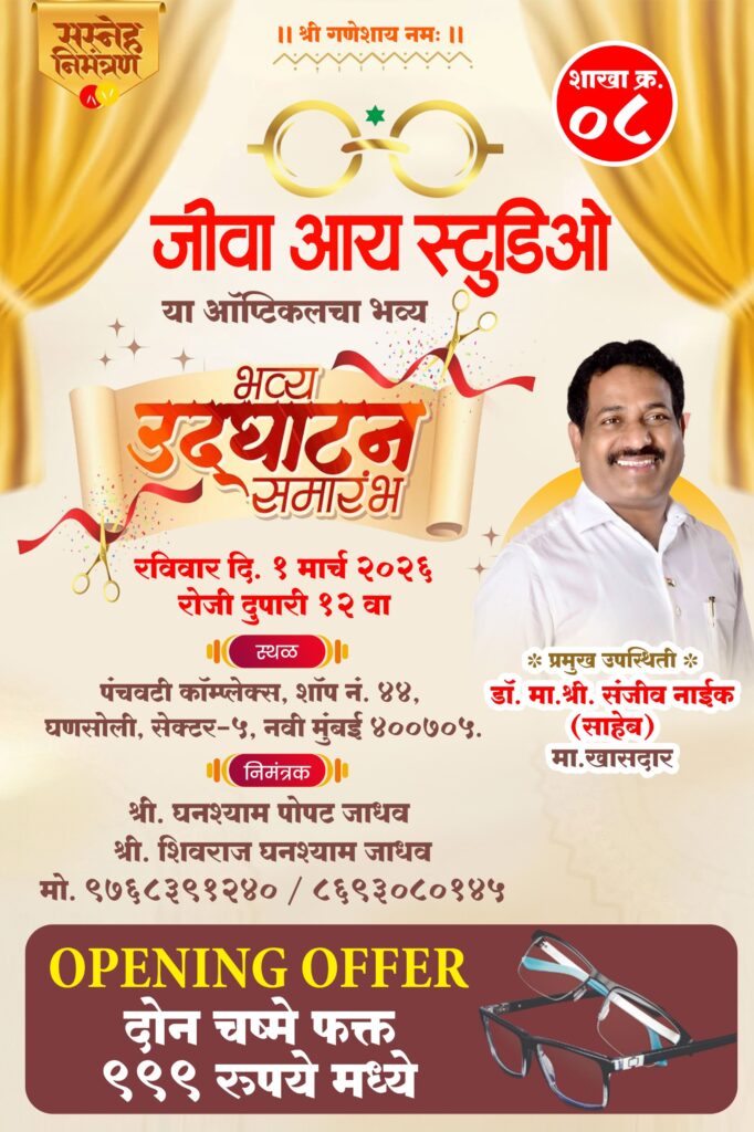 उद्घाटन प्रसंगी खासदार संजीवजी नाईक साहेब यांनी नवीन व्यवसायाला शुभेच्छा देताना सांगितले की, “नवी मुंबईत दर्जेदार आणि विश्वासार्ह व्हिजन केअर सेवा उपलब्ध होणे ही काळाची गरज आहे. जीवा आय स्टुडिओसारख्या आधुनिक ऑप्टिकल स्टुडिओमुळे नागरिकांना उच्च दर्जाच्या सेवा स्थानिक पातळीवर मिळतील.” त्यांच्या हस्ते फीत कापून आणि दीपप्रज्वलन करून शोरूमचे उद्घाटन करण्यात आले.